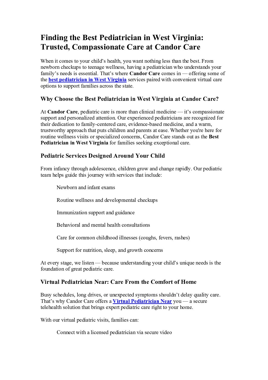 Best Pediatrician in West Virginia | Virtual Pediatrician Near – Candor Care by candorecare Published: April 7, 2026 (1 week ago) Category Health Link Best Pediatrician in West Virginia | Virtual Pediatrician Near - Candor Care Need a Best Pediatrician in West Virginia Candor Care provides same day appointments with best pediatricians in West Virginia From newborns to teens, our pediatricians provide quality care, you can trust
